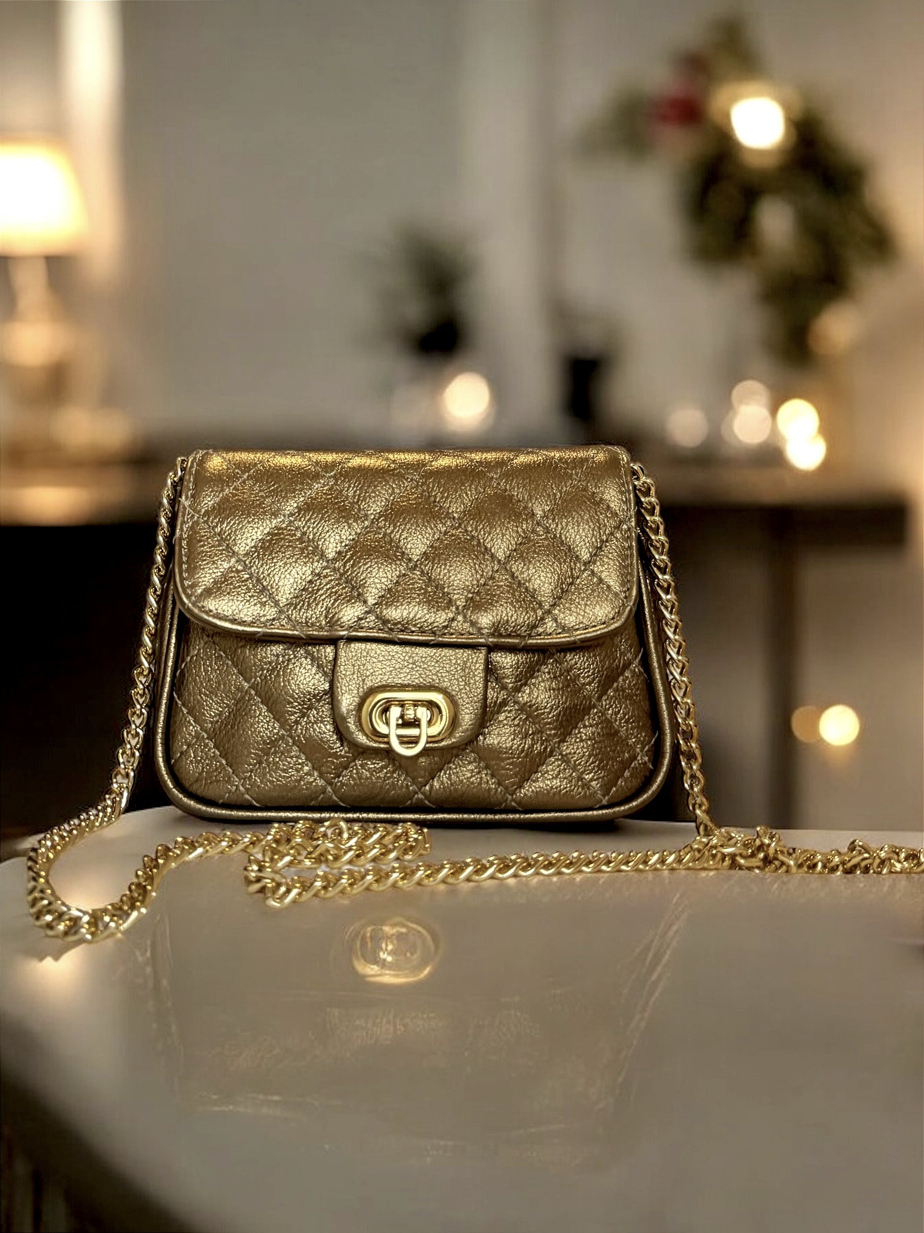 Mini bag toda feita no couro 100% genuíno de alto padrão no matelassê. Essa bag é sinônimo de luxo, e o seu diferencial é o metalizado que está super em alta. Quando você adquire um item desse porte, você está garantindo a sofisticação a cada vez que o usa. Ele é clássico e contemporâneo, e a bola da vez é cor; todos os tons no metalizado são muito bem vindos nessa coleção, e o ouro velho se tornou uma cor de sucesso devido a riqueza que ela carrega.