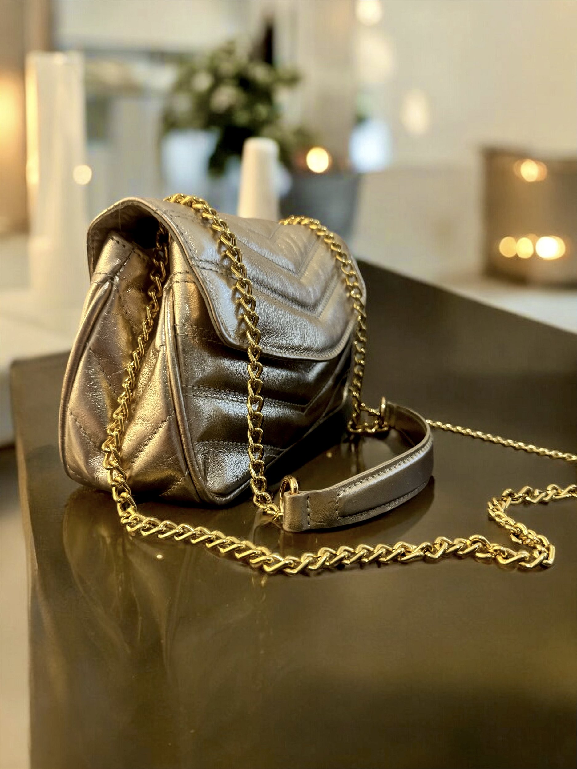 Essa bolsa é sinônimo de luxo, sua aparência exuberante e única, à classifica como um item suntuoso. Toda feita no couro genuíno no matelassê ouro, ela é um acessório indispensável no closet de toda mulher; seu charme se destaca pela corrente dourada e seu tamanho menor, que à classifica como requintada, você à leva em qualquer ambiente apenas com os itens indispensáveis: como celular, chaves, gloss, óculos e um porta cartões; precisa mais do que isso?