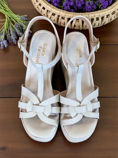 A anabela off white combina muito bem com vestidos fluidos, sendo lisos ou estampados, saias midi e pantalonas para um visual fresco, ou com alfaiataria para um look de trabalho elegante. É uma ótima opção para looks casuais, como com shorts jeans, e para eventos que exigem conforto sem abrir mão do estilo. Para um look sofisticado, combine com acessórios dourados, que criam uma harmonia chic com a cor clara do calçado.