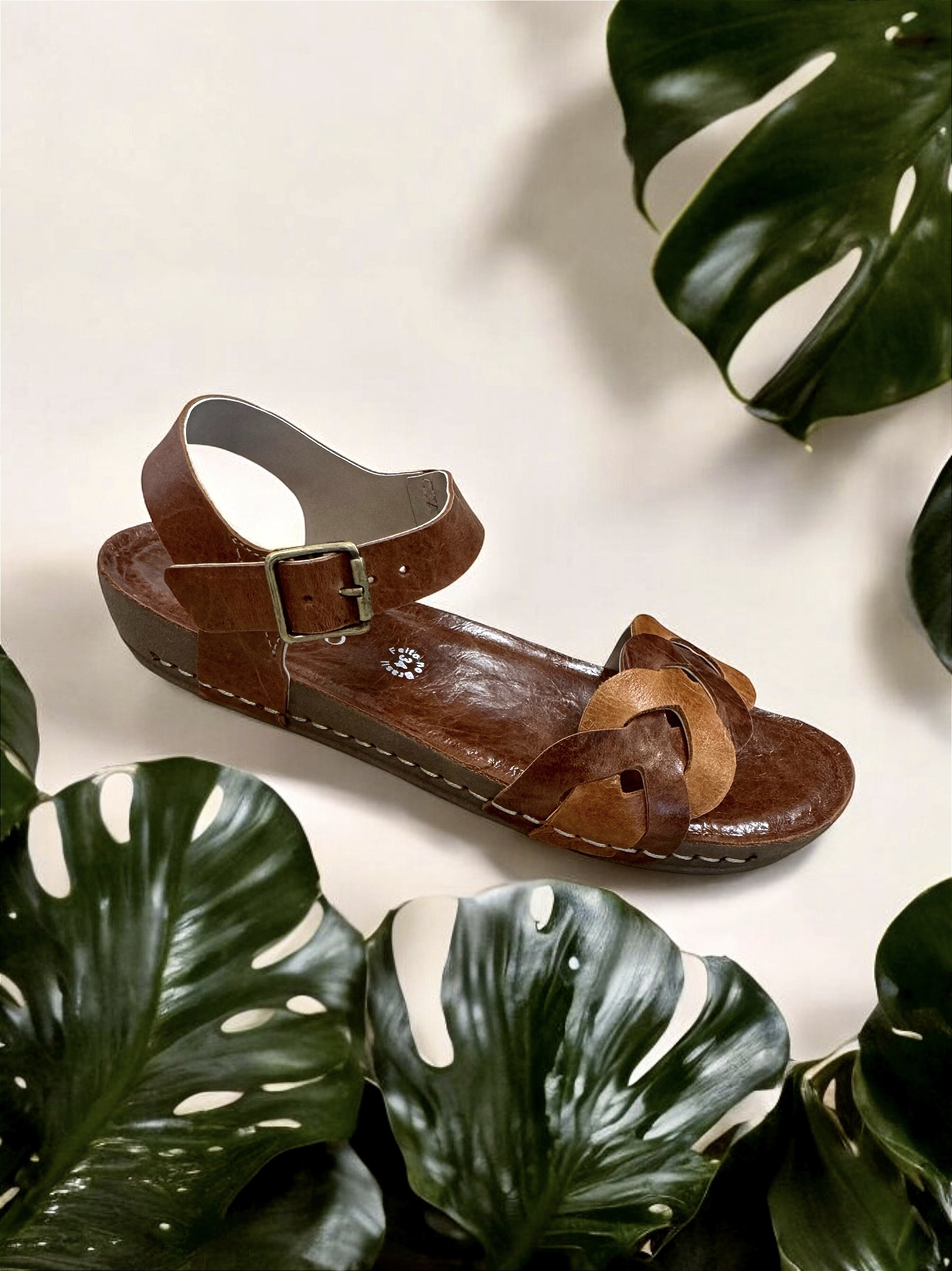 Cabedal: couro 100% legítimo entrelaçado nas cores madeira e caramelo rústico