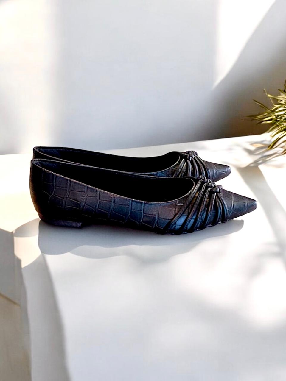 Sapatilha preta no croco é uma das mais pedidas, ela tem charme, elegância e poder, pois o preto significa isso.